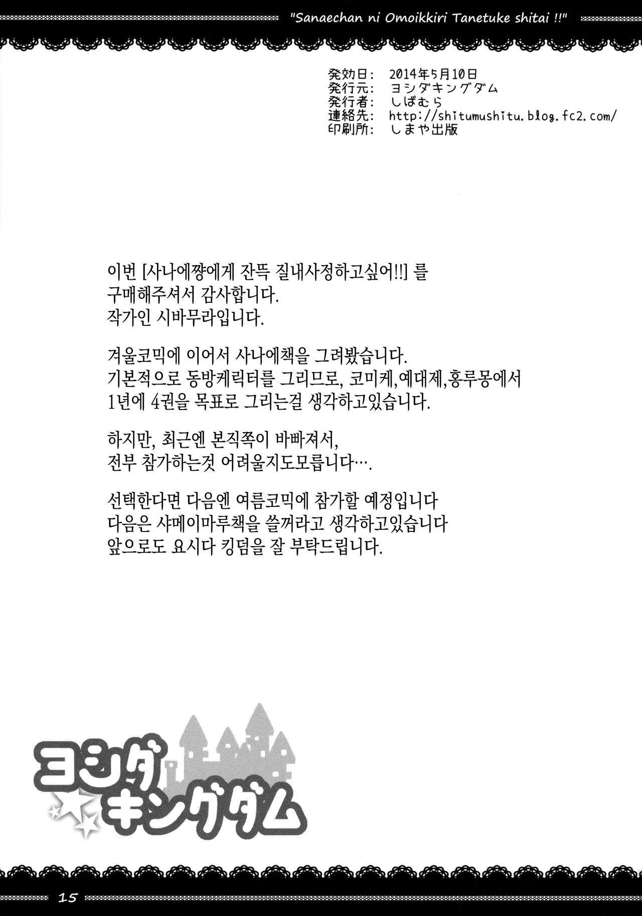 (例大祭12) [ヨシダキングダム (しばむら)] 早苗ちゃんに思いっきり種付けしたい!! (東方Project) [韓国翻訳]